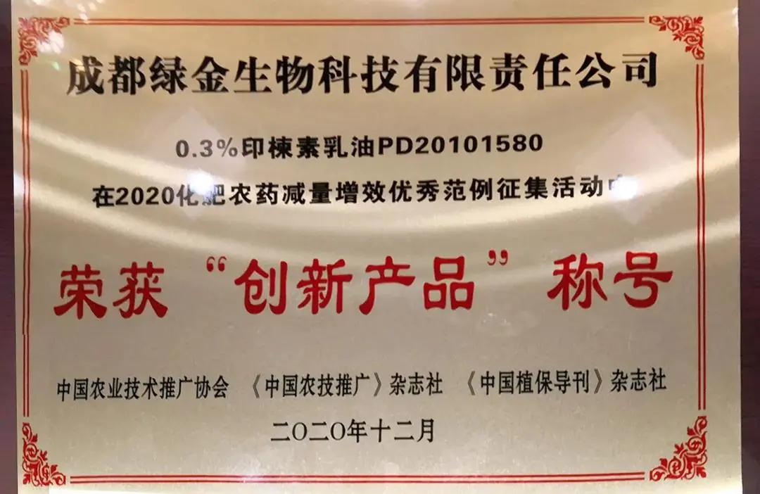 绿金生物印恋0.3%印楝素乳油荣获“创新产品”称号